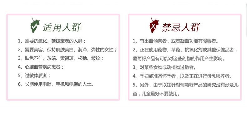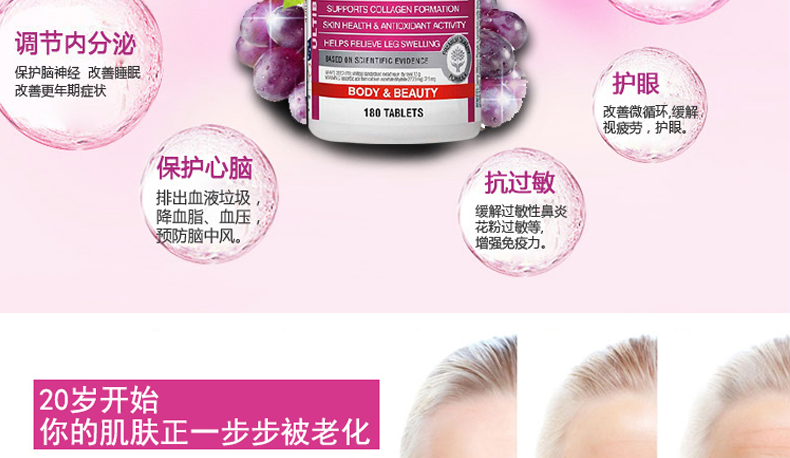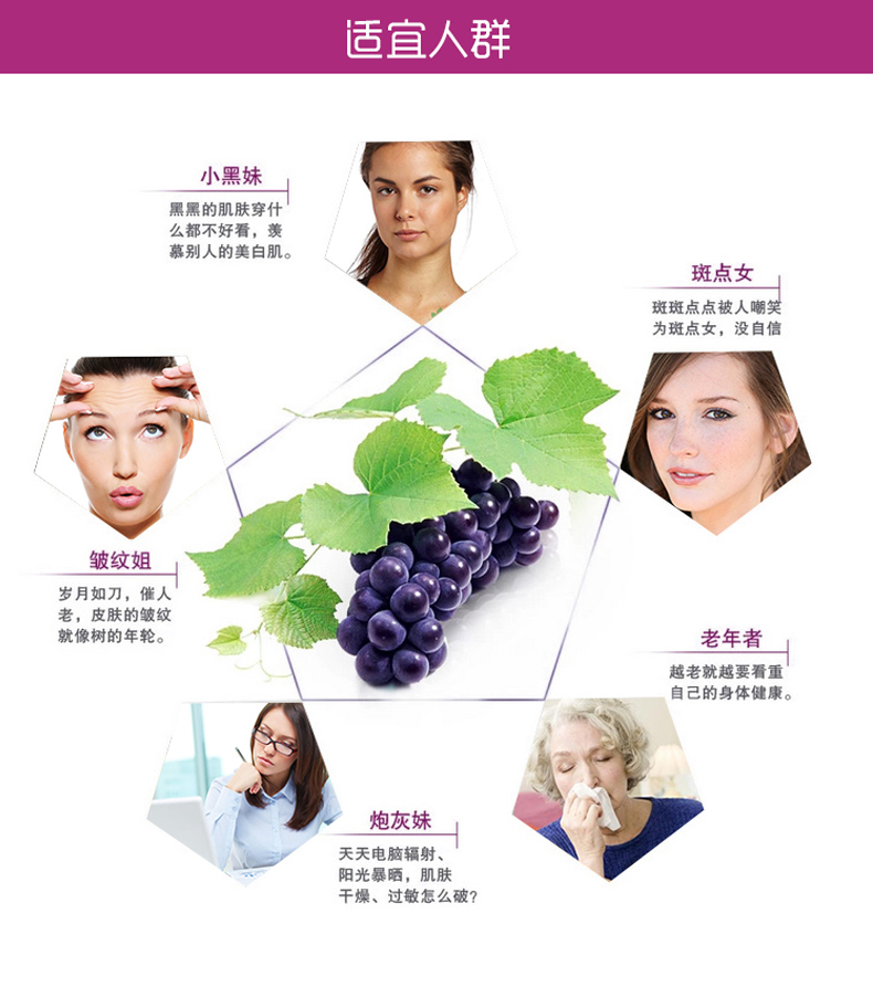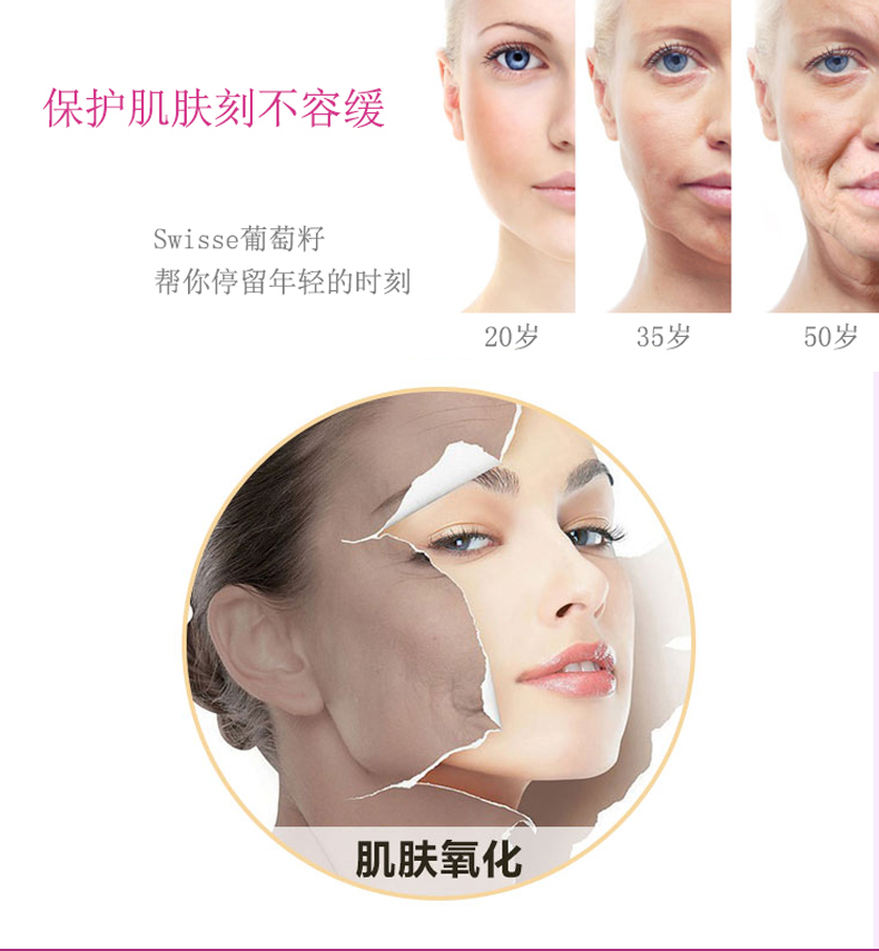 葡萄籽的主要提取物原花青素(OPC)可是世界上公认的最佳女性抗衰老营养补充品哦!都市女性受到压力和环境污染的影响25岁之后就开始出现皱纹,色斑,肤色暗淡等等一系列肌肤问题,有些40岁就提前进入更年期,加速衰老。研究表明,OPC能高效的清除人体体内的大量自由基,并隔离污浊空气,紫外线和化妆品等外来因素,使皮肤免受 伤害,阻碍黑色素形成,促进新生细胞的迅速分裂,达到美白肌肤的作用。