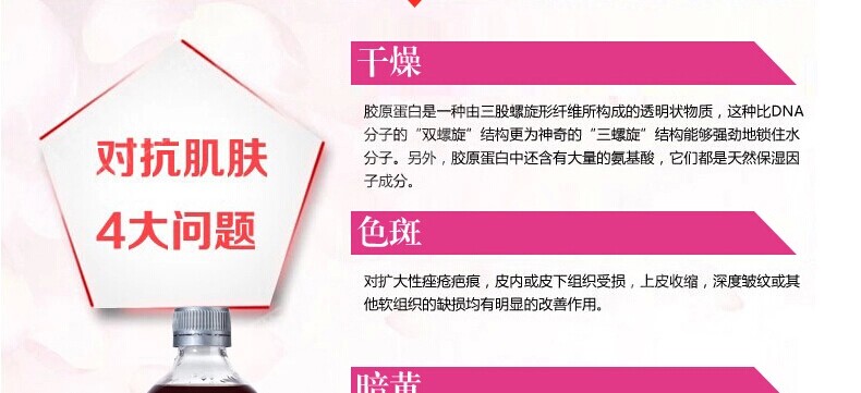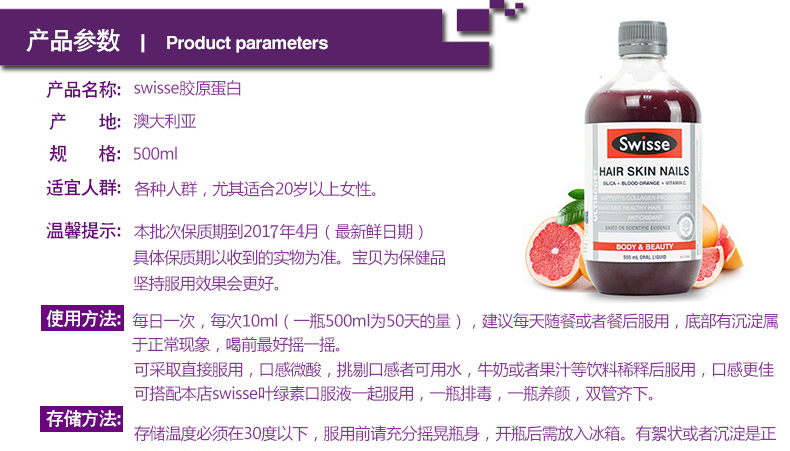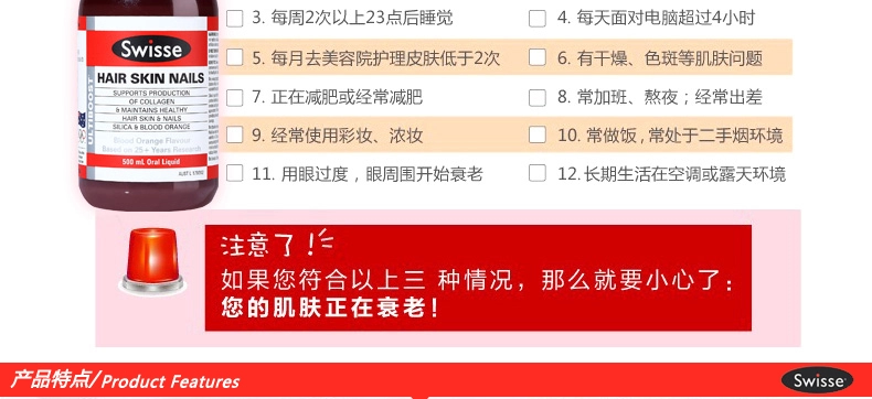【产品特点】 Swisse液体胶原蛋白是一种复杂的配方含高质量的营养成分去支持胶原蛋白的产生, 提供头发、皮肤、指甲必需的营养,胶原蛋白能保湿、滋养、亮肤、紧肤、防皱、修复、营养皮肤的作用。