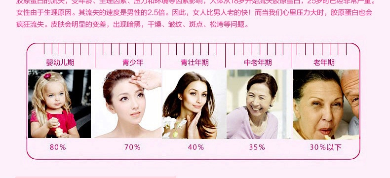 【为什么要补充胶原蛋白】人的衰老,是由胶原蛋白的流失所造成的。胶原蛋白的流失,受年龄、生理因素、压力和环境等因素影响,人体从18岁开始流失胶原蛋白,25岁时已经非常严重。女性由于生理原因。其流失的速度是男性的2.5倍。因此,女人比男人老的快!而当我们心里压力大时,胶原蛋白也会疯狂流失。皮肤会明显的变差,出现暗黑,干燥、皱纹、斑点、松垮等问题~~