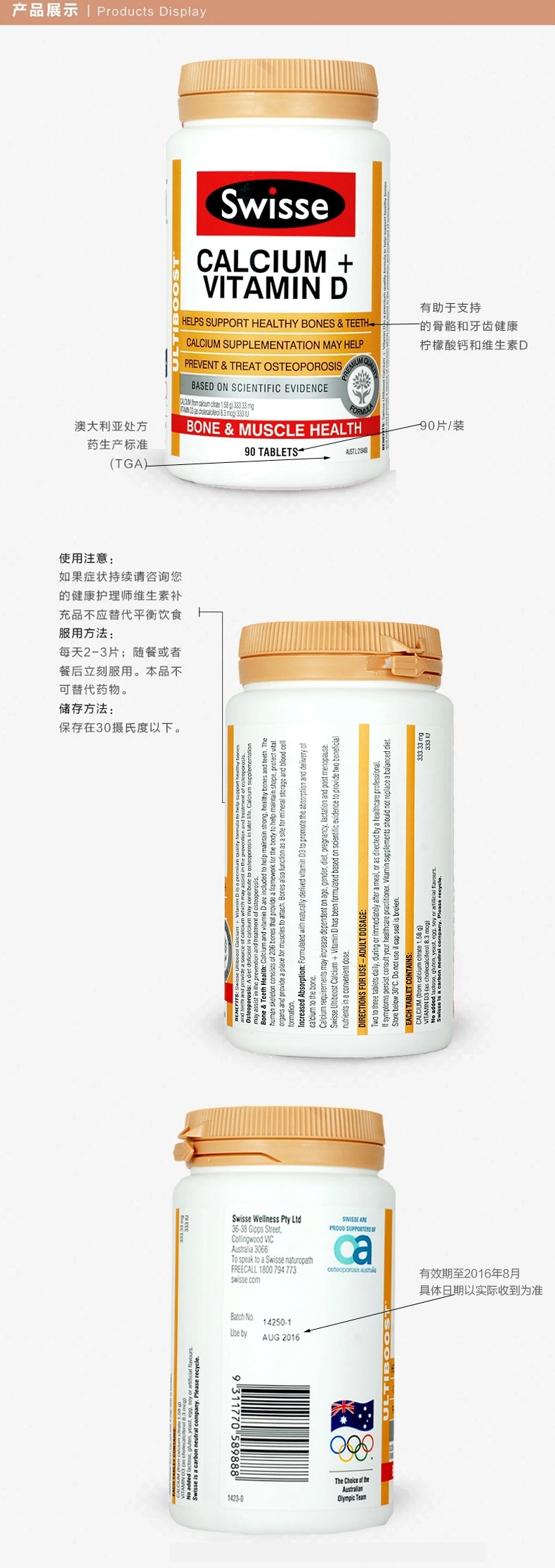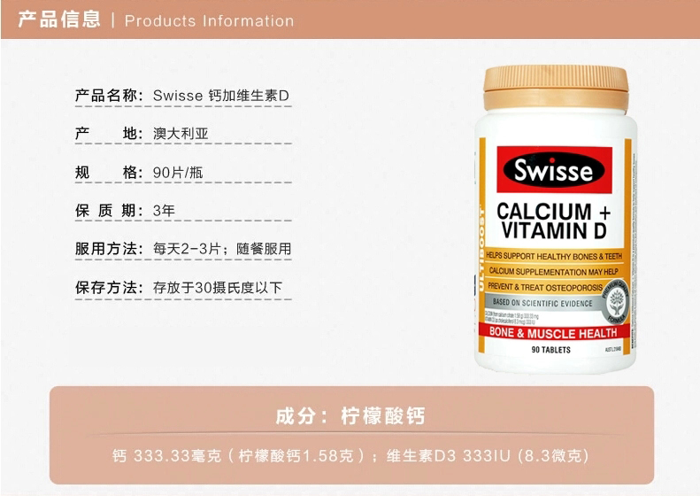 孙俪指定柠檬酸钙 Swisse钙+维生素D片使用的是优质钙来源:柠檬酸钙,以及天然维生素D3,增加钙的吸收。