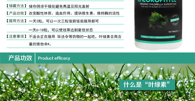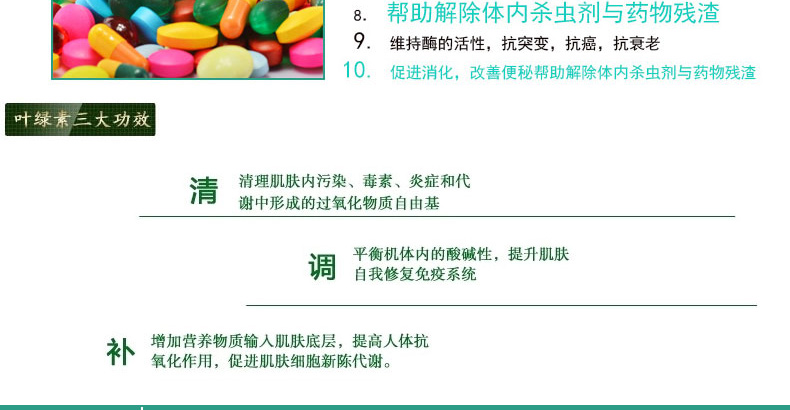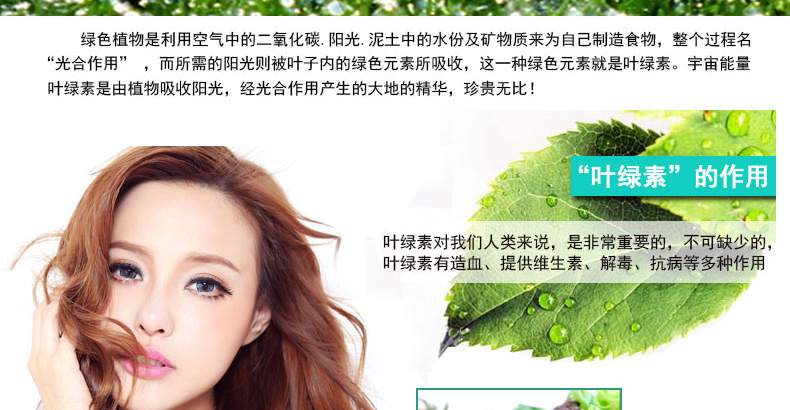 【提供维生素】叶绿素中含有大量的维生素C与无机盐,,是人体生命活动中不可缺少的物质,还可以保持体液的弱碱性,有利于健康。