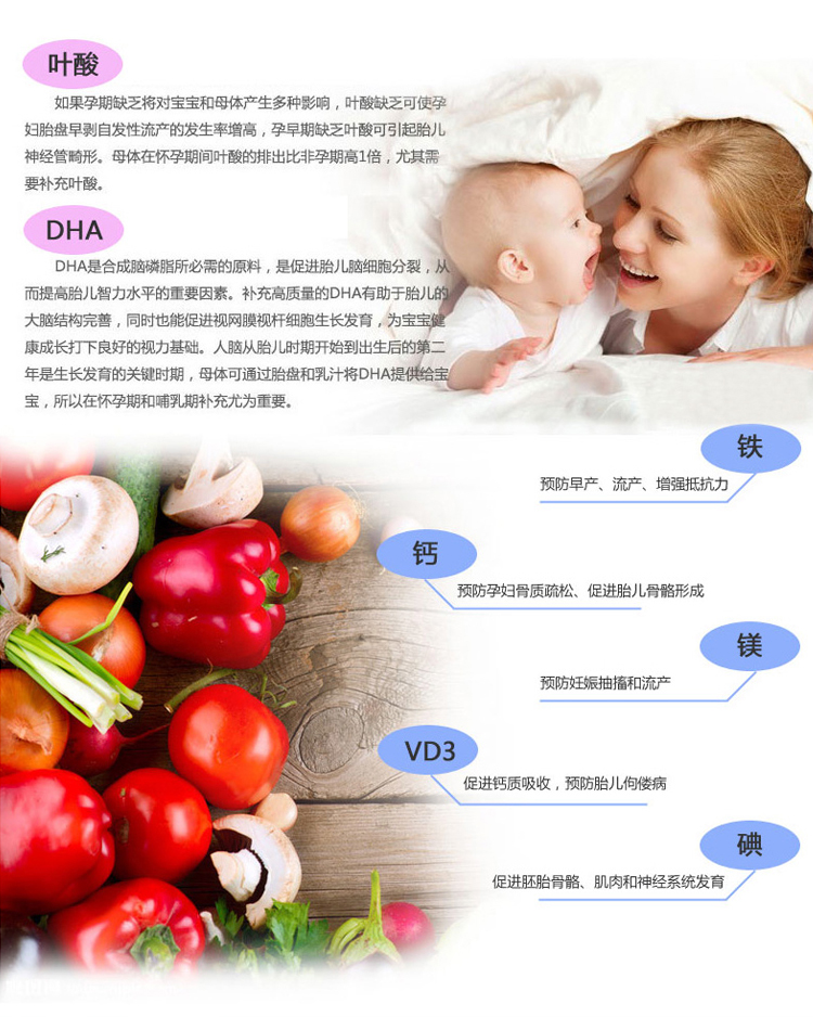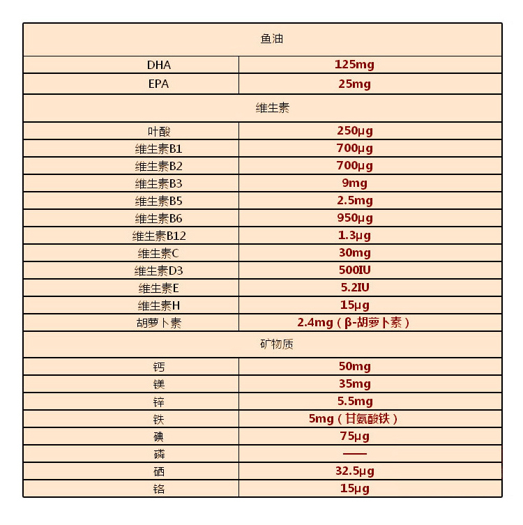 【产品成分】DHA, 叶酸, 胡萝卜素, VB, VC, VD, VE, 硒, 钙, 铁, 锌, 镁