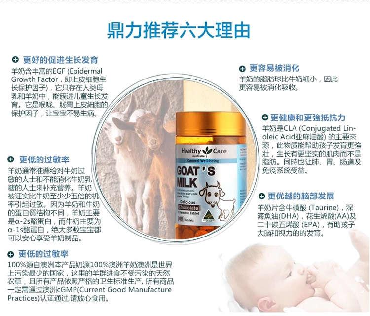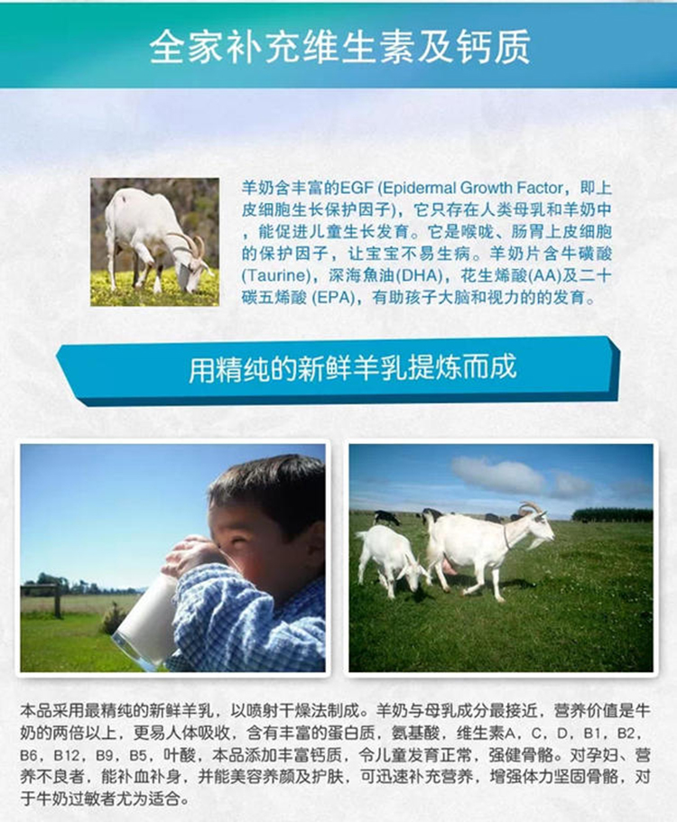 更好的促进生长发育羊奶含丰富的EGF (Epidermal Growth Factor,即上皮細胞生长保护因子),它只存在人类母乳和羊奶中,能簇进儿童生长发育。它是喉咙、肠胃上皮細胞的保护因子,让宝宝不易生病。