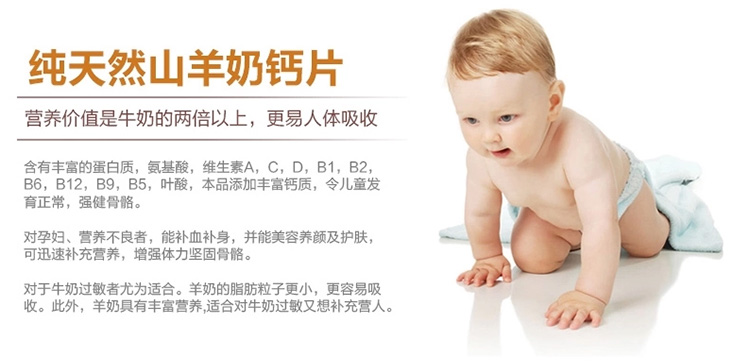 healthy care纯天然山羊奶钙片,采用最精纯的新鲜羊乳,以喷射干燥法制成。羊奶与母乳成分最接近,营养价值是牛奶的两倍以上,更易人体吸收,含有丰富的蛋白质,氨基酸,维生素A,C,D,B1,B2,B6,B12,B9,B5,叶酸,本品添加丰富钙质,令儿童发育正常,强健骨骼。对孕妇、营养不良者,能补血补身,并能美容养颜及护肤,可迅速补充营养,增强体力坚固骨骼,对于牛奶过敏者尤为适合。羊奶的脂肪粒子更小,更容易吸收。此外,羊奶具有丰富营养,适合对牛奶过敏又想补充营人。