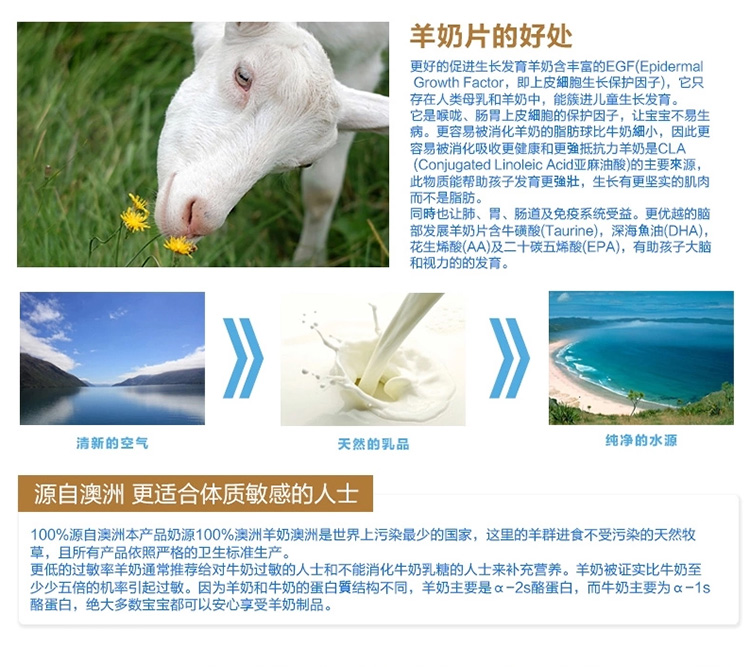 100%源自澳洲本产品奶源100%澳洲羊奶澳洲是世界上污染最少的国家,这里的羊群进食不受污染的天然牧草,且所有产品依照严格的卫生标准生产。